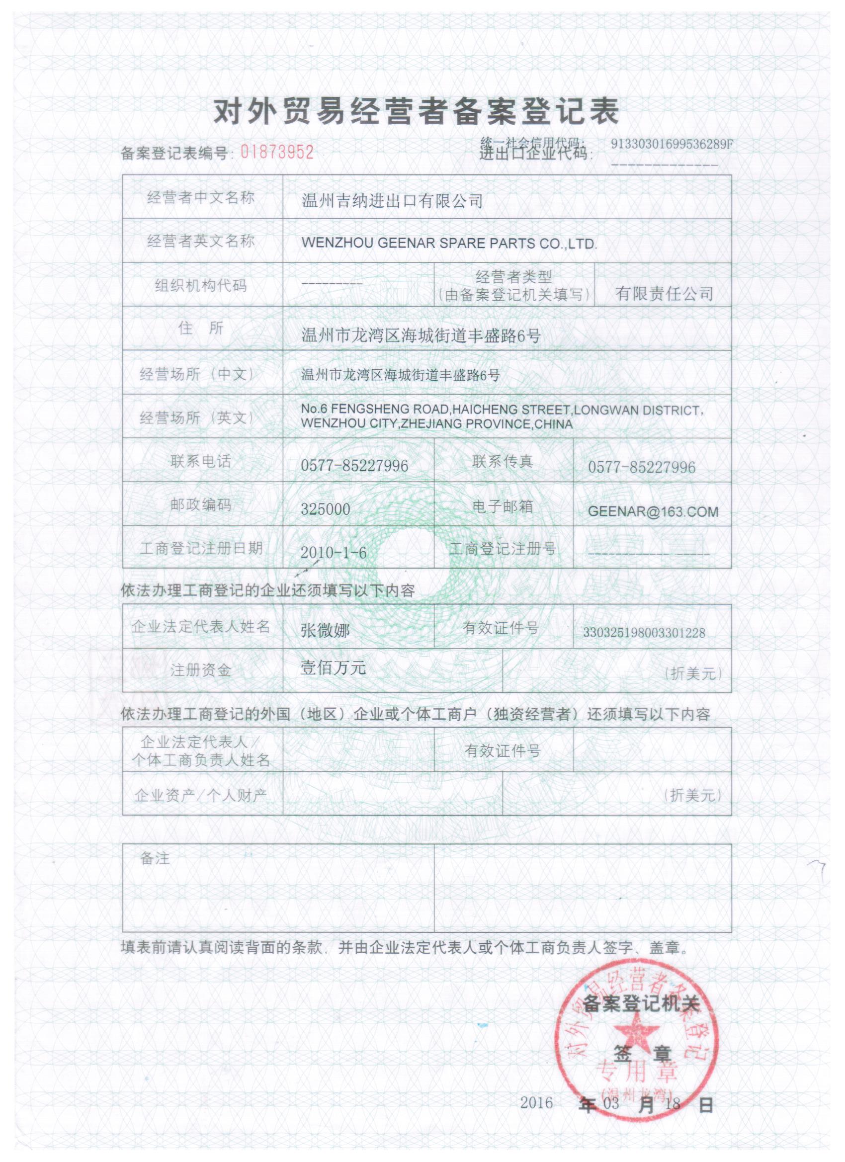 Export Company Name: WENZHOU GEENAR SPARE PARTS CO.,LTD.